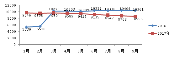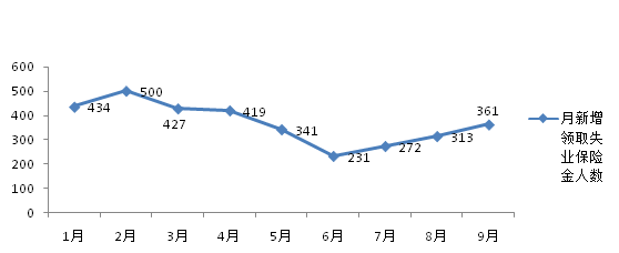 截至9月,全市领取失业保险金人数8555人,比去年同期减少1806人,比去年末减少1372人,呈现逐月下降的趋势(见图二)。